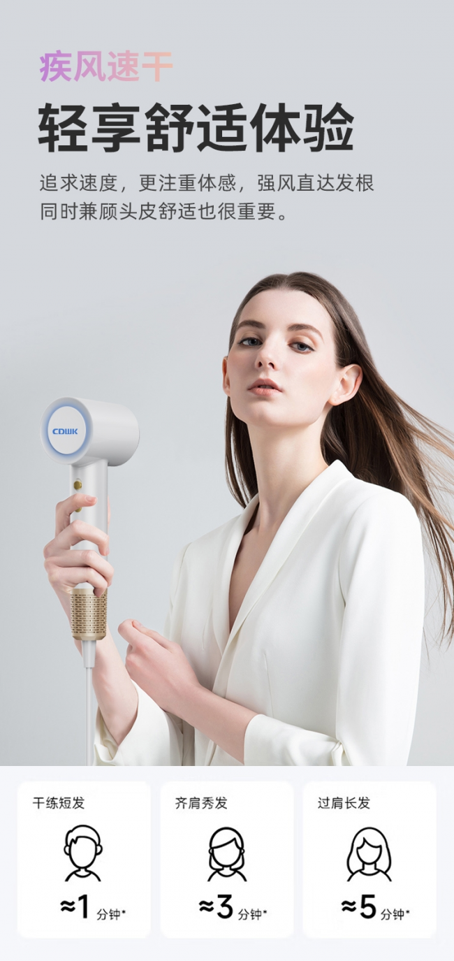 CDWK創(chuàng)點近期推出的新生代高速吹風(fēng)機,配備強勁的風(fēng)力,高效將水分從頭發(fā)中吹干,使人們從此告別繁瑣低效的吹頭發(fā)環(huán)節(jié)。